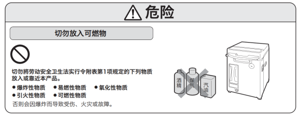 绝不使用爆炸性、可燃性以及含有此类物质的物品进行灭菌!